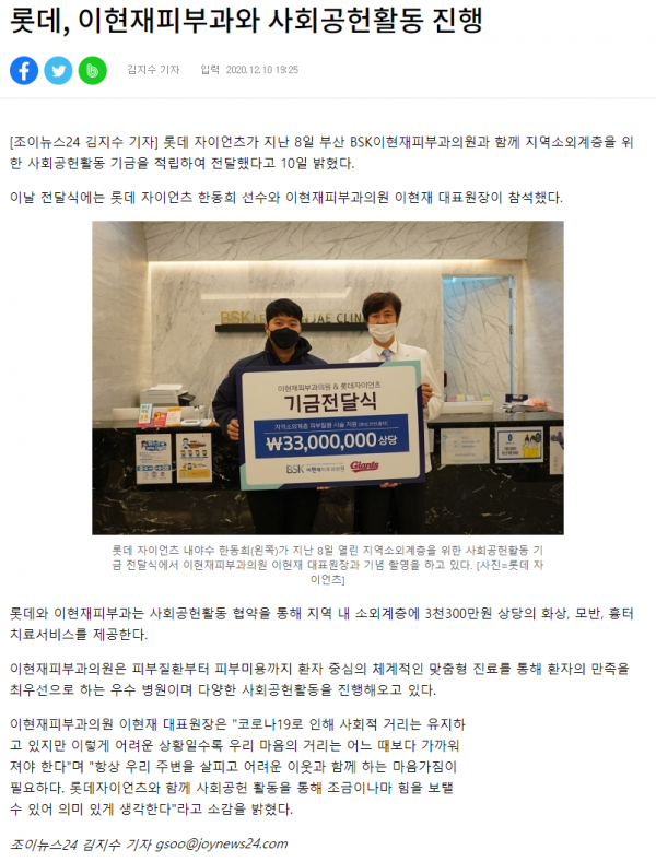 [기사] 롯데, 이현재피부과와 사회공헌활동 진행